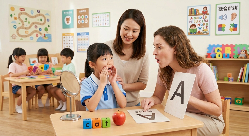- 外師精準口型示範: 專業外師細心引導孩子觀察嘴型與舌頭位置,確保發出最道地的國際音。